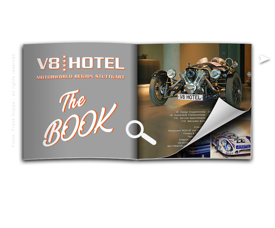 Die Online-Blätter-Broschüre rechts für das V8 HOTEL Region Stuttgart sowie die Fotografien auf der Webseite des Hotels spiegeln die inhaltliche Bandbreite wieder.